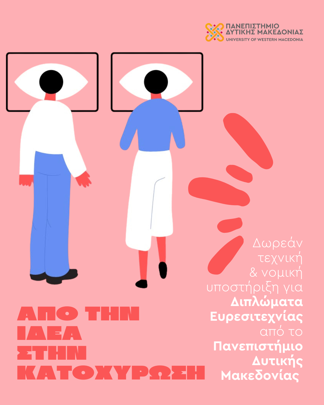 Δωρεάν τεχνική και νομική υποστήριξη για την κατοχύρωση Διπλωμάτων Ευρεσιτεχνίας προσφέρεται σε μέλη της ακαδημαϊκής και ερευνητικής κοινότητας του Πανεπιστημίου Δυτικής Μακεδονίας που έχουν αναπτύξει μια καινοτόμα ιδέα και θέλουν να την προστατεύσουν και να την αξιοποιήσουν.