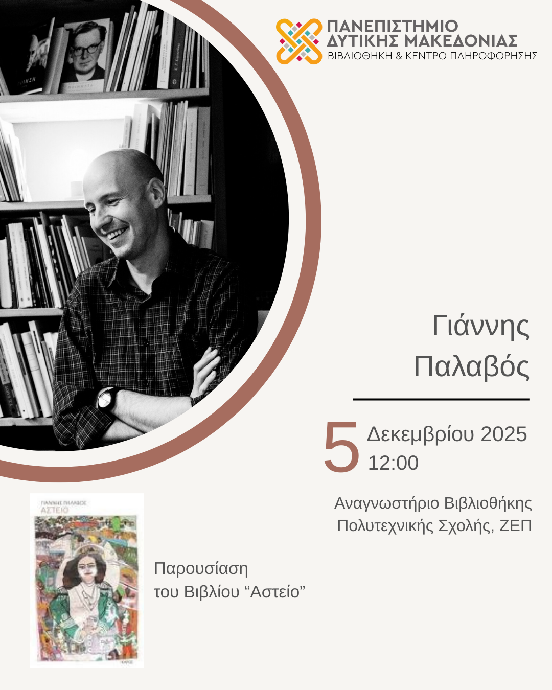 Η Βιβλιοθήκη και το Κέντρο Πληροφόρησης του Πανεπιστημίου Δυτικής Μακεδονίας διοργανώνουν και σας προσκαλούν στη συνάντηση με το συγγραφέα  του βιβλίου «Το Αστείο» Γιάννη Παλαβό, την Παρασκευή 5 Δεκεμβρίου 2025, στις 12:00, στο Αναγνωστήριο της Βιβλιοθήκης της Πολυτεχνικής Σχολής στη ΖΕΠ Κοζάνης. Η εκδήλωση αποτελεί μια ευκαιρία γνωριμίας με το έργο και τη δημιουργική πορεία του συγγραφέα.