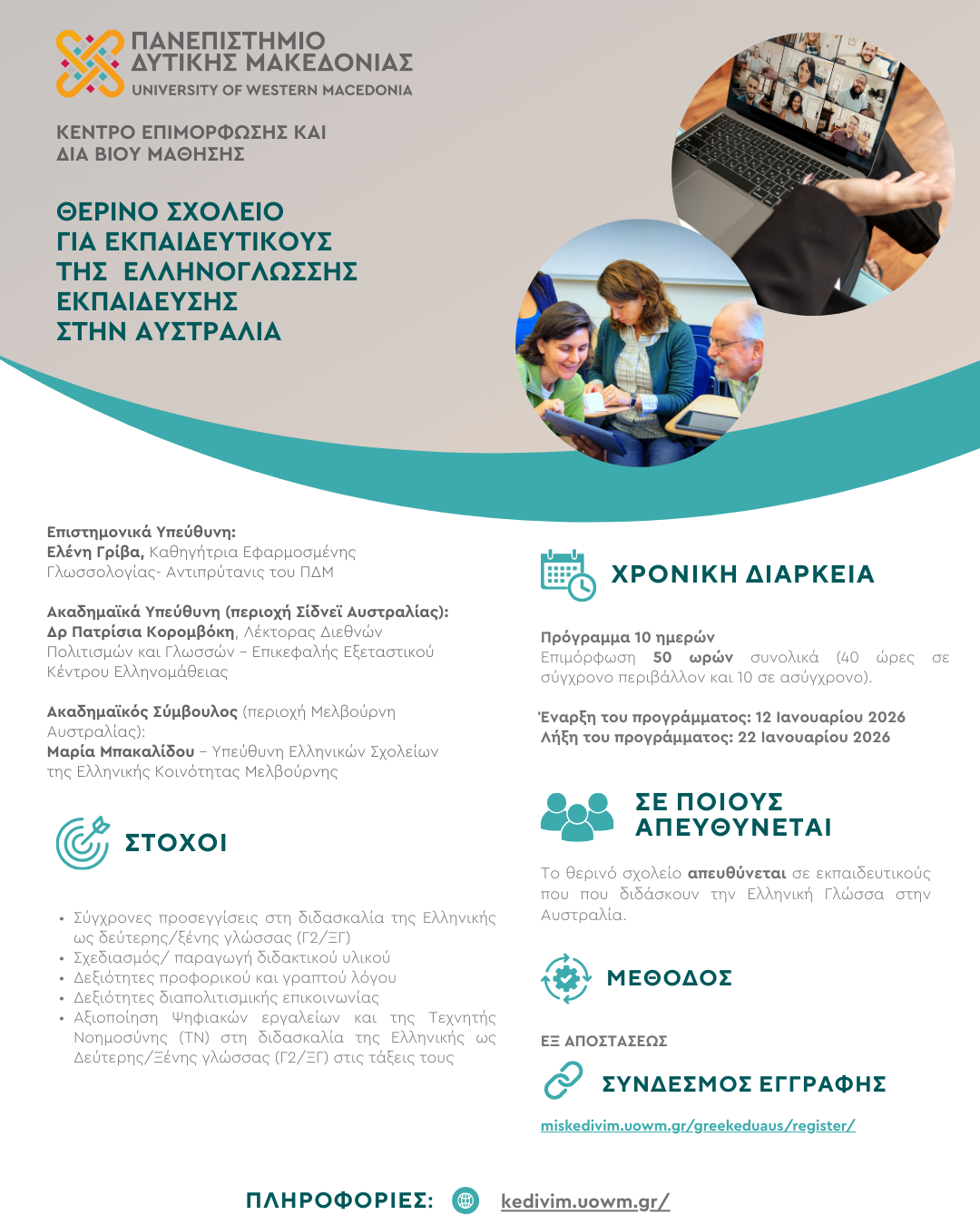 Πάνω στην αντιστροφή των εποχών, με καλοκαίρι στην Αυστραλία και χειμώνα στην Ελλάδα, το Πανεπιστήμιο Δυτικής Μακεδονίας υλοποιεί ένα νέο, εξ αποστάσεως Θερινό Σχολείο προσαρμοσμένο στις σύγχρονες ανάγκες των εκπαιδευτικών της ελληνικής ως δεύτερης ξένης γλώσσας στην Αυστραλία.