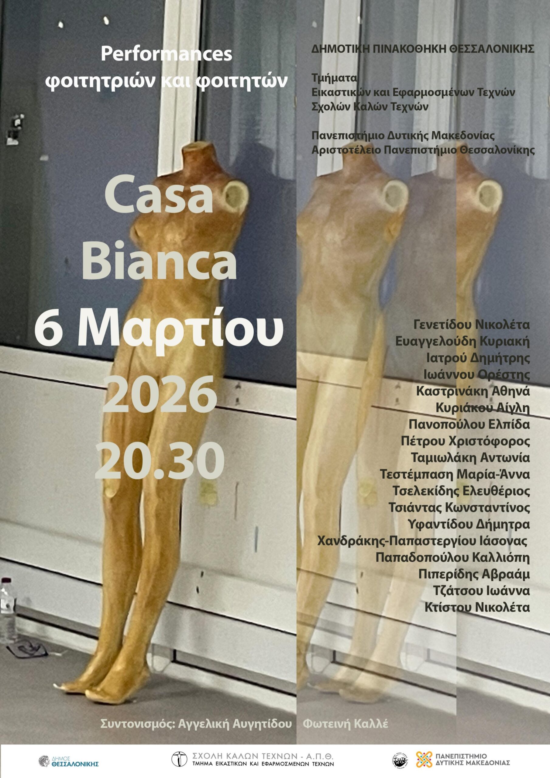 Την Παρασκευή 6 Μαρτίου 2026 και ώρα 20:30, στη Δημοτική Πινακοθήκη Θεσσαλονίκης – Casa Bianca, φοιτήτριες και φοιτητές των Τμημάτων Εικαστικών και Εφαρμοσμένων Τεχνών των Σχολών Καλών Τεχνών του Πανεπιστημίου Δυτικής Μακεδονίας και του Αριστοτελείου Πανεπιστημίου Θεσσαλονίκης παρουσιάζουν έργα περφόρμανς στο πλαίσιο του εορτασμού της Παγκόσμιας Ημέρας της Γυναίκας.